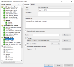 I grabbed the stand-alone installer for VC++ 2015, packaged that up, then applied it to my task sequence. I also created some basic .CMD files to copy the volume license file and to clean the desktop of the shortcuts that Sketchup created.