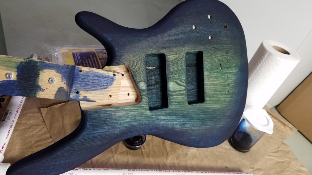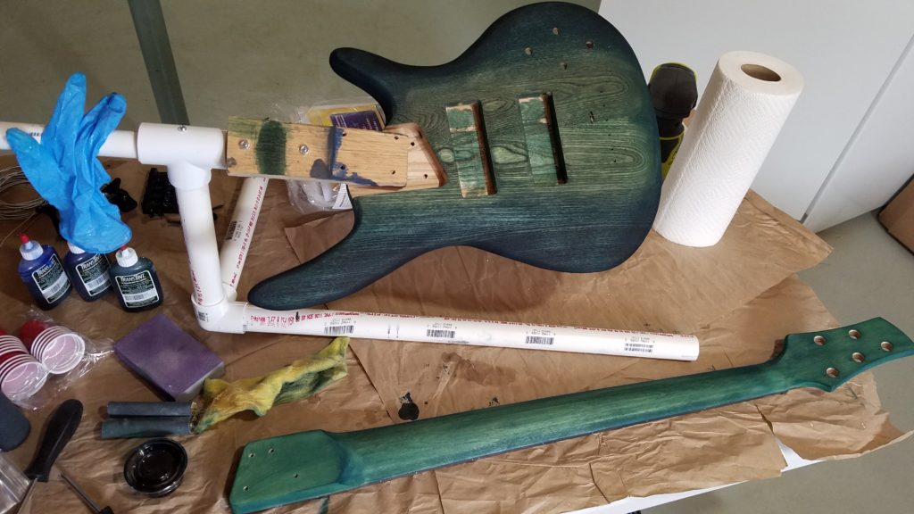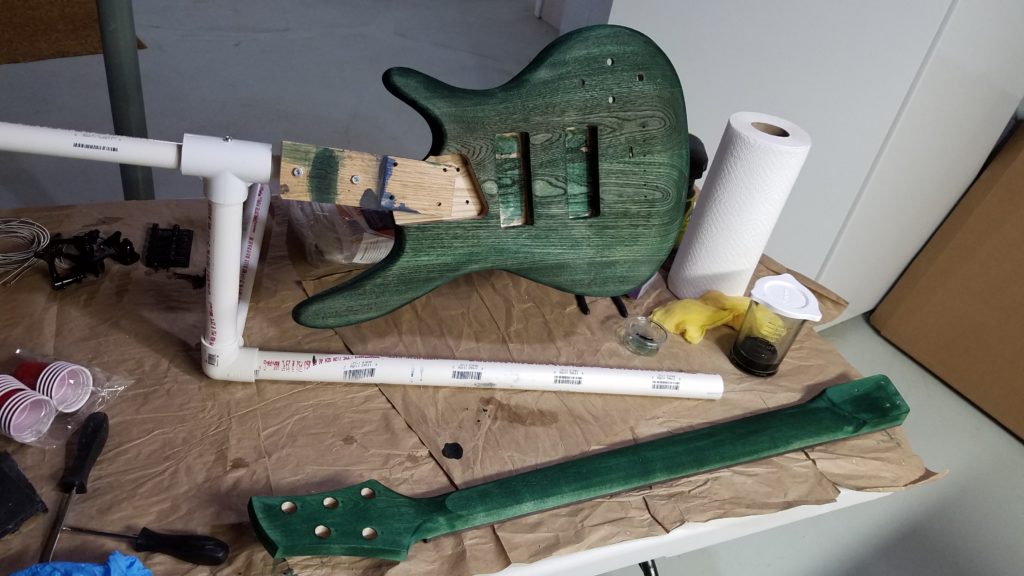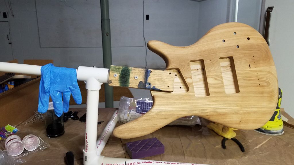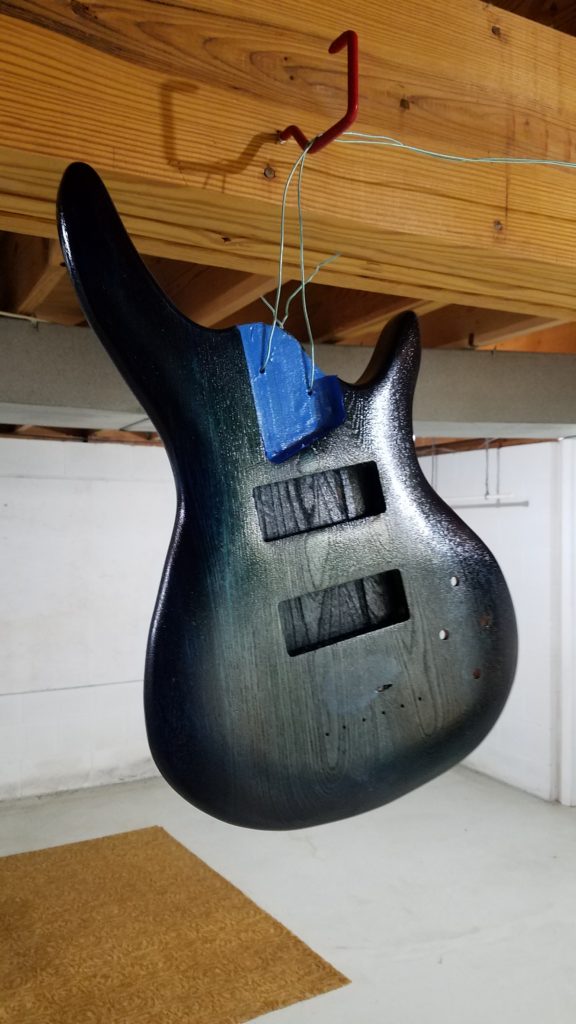 Last week, we were up north so I could start working on Ke Kai as well as finishing Blue-J. I sanded down the body of the bass to smooth out the dings and such, and also ran some major sanding on the neck. I attached the body to the rig and began prep and color.